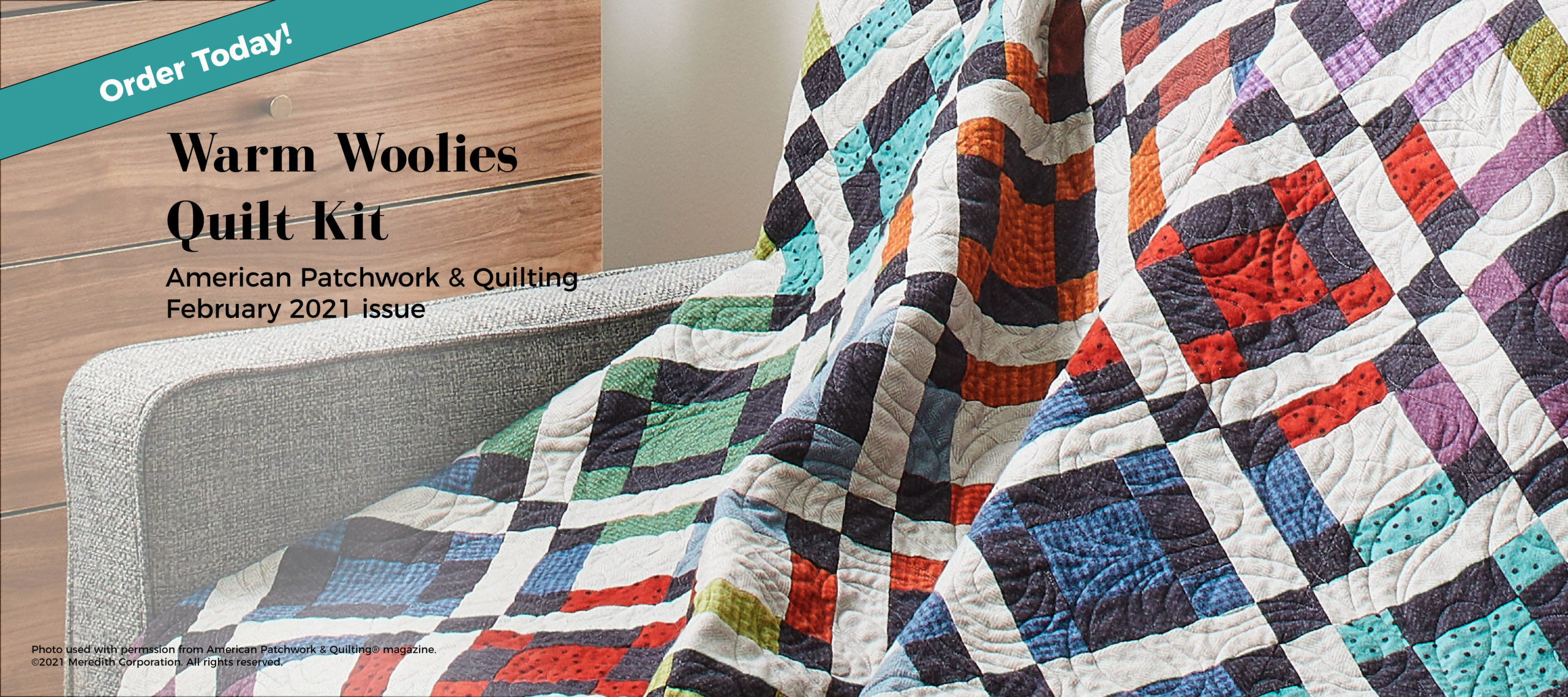 Hi again, and welcome back Inside the Studio. A couple weeks ago, I shared with you that my Warm Woolies quilt was featured in the February 2021 issue of American Patchwork & Quilting. To add to this excitement, I am happy to let you know that I now have a quilt kit available for this quilt. That's right, make your own replica of the Warm Woolies as shown in the magazine. Woohoo! Now this is something to get excited about. I know I am. Used with permission from American Patchwork &